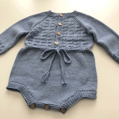 • Classic and chic hand knitted baby romper featuring sweet lace and popcorn patterns on the upper body